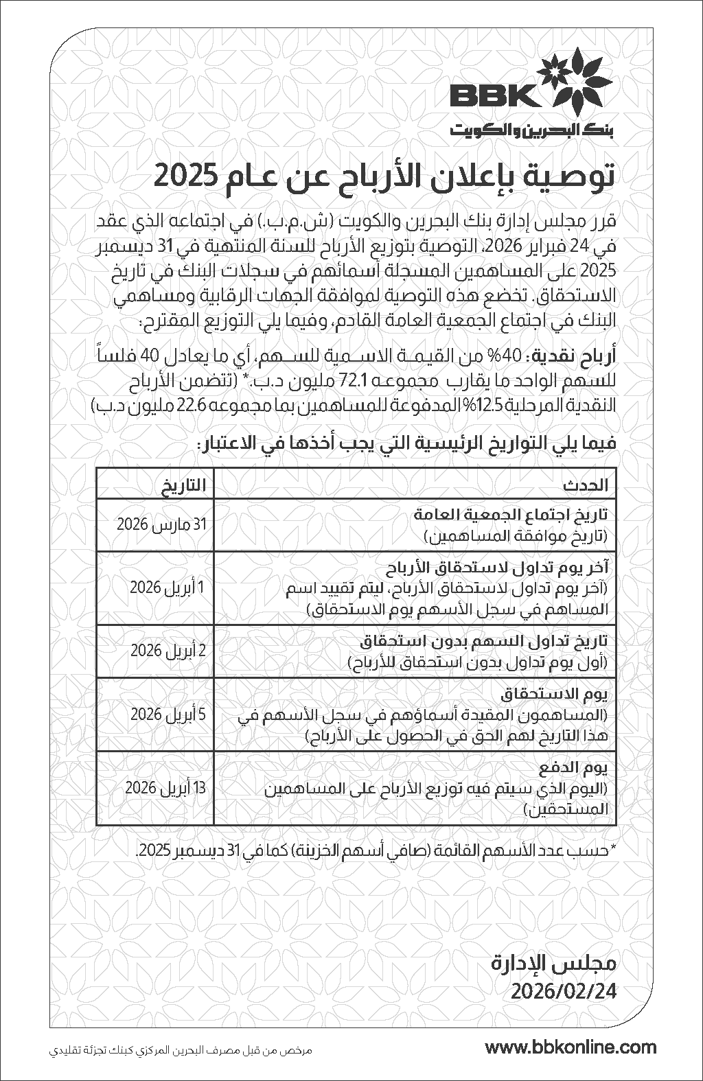 بنك البحرين والكويت يفصح عن نتائجه المالية للسنة المنتهية في 31 ديسمبر 2025
